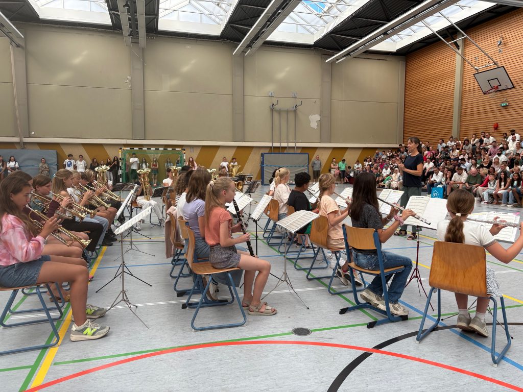 Für 200 Fünftklässlerinnen und Fünftklässler war dieser Tag besonders aufregend. Im Rahmen einer kleinen Feier wurden sie in die Schulgemeinschaft aufgenommen. Das Bläserorchester sorgte mit schwungvollen Rhythmen für eine fröhliche Atmosphäre. Nach der Ansprache der Schulleiterin Dr. Schmidt und ermutigenden Worten der beiden Schulelternvertreterinnen ging es endlich los: Die Kinder konnten gemeinsam mit ihren Klassenlehrerinnen ihre neuen Räume beziehen.