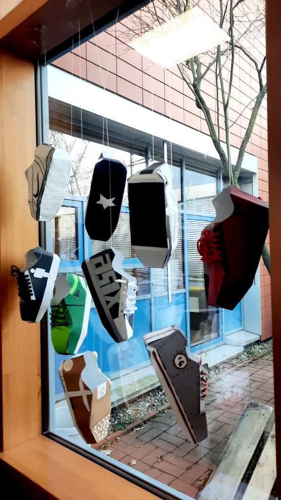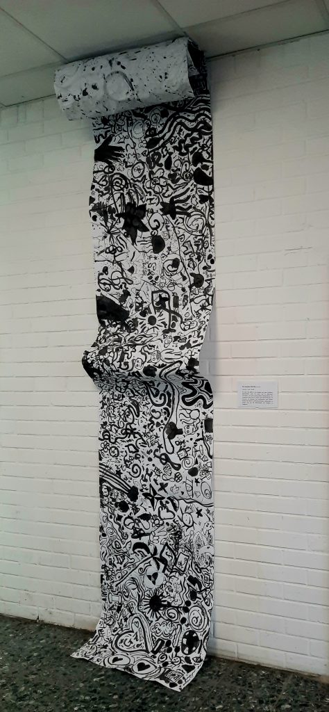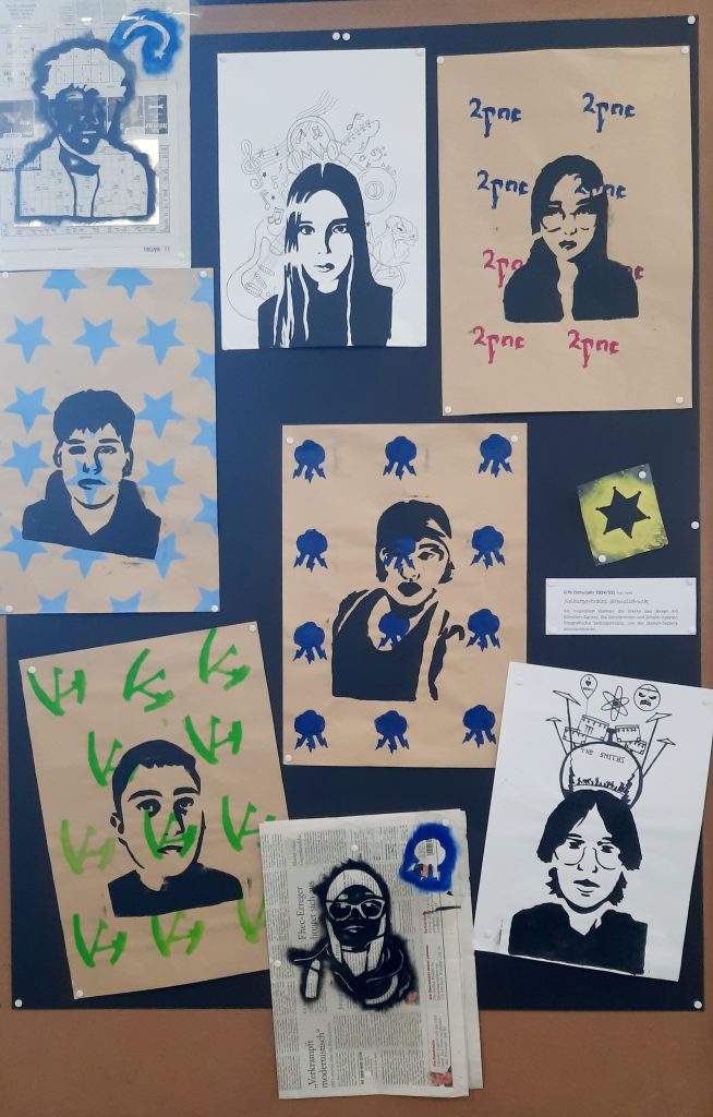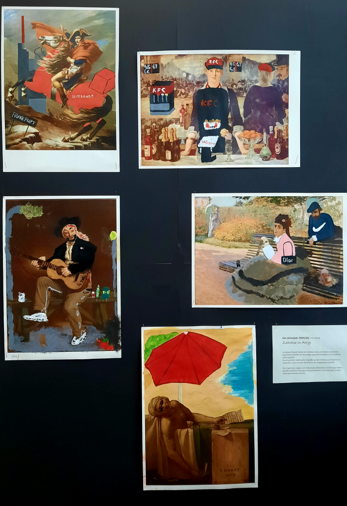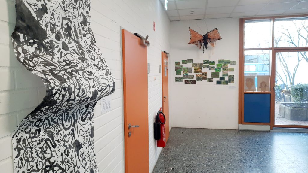 Beim Tag der offenen Tür konnten Besucherinnen und Besucher in der Kunstausstellung selbst kreativ werden. Im Sumi Ink Club entstand ein gemeinsames Kunstwerk, an dem viele Gäste gemeinsam malten. Dabei konnten zukünftige Schülerinnen und Schüler nicht nur ihre Kreativität ausprobieren, sondern auch erste Kontakte zu möglichen neuen Klassenkameradinnen und Klassenkameraden knüpfen. Die Teilnehmenden ließen sich von den Arbeiten der anderen inspirieren und erweiterten das Bild Schritt für Schritt – ohne etwas zu übermalen oder Worte zu schreiben. So entstand ein beeindruckendes Gemeinschaftswerk.