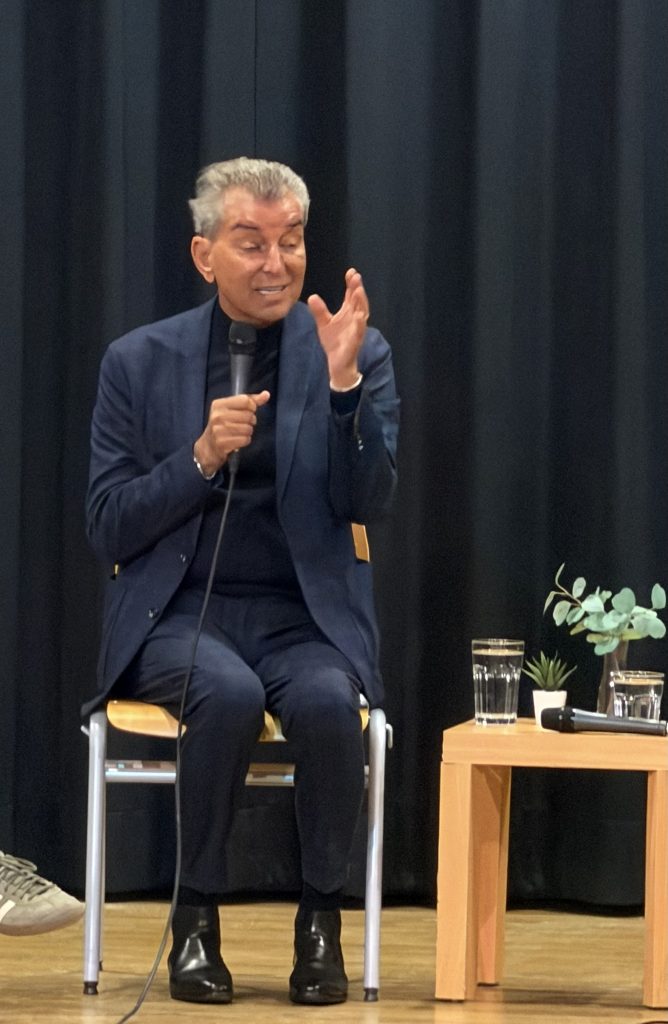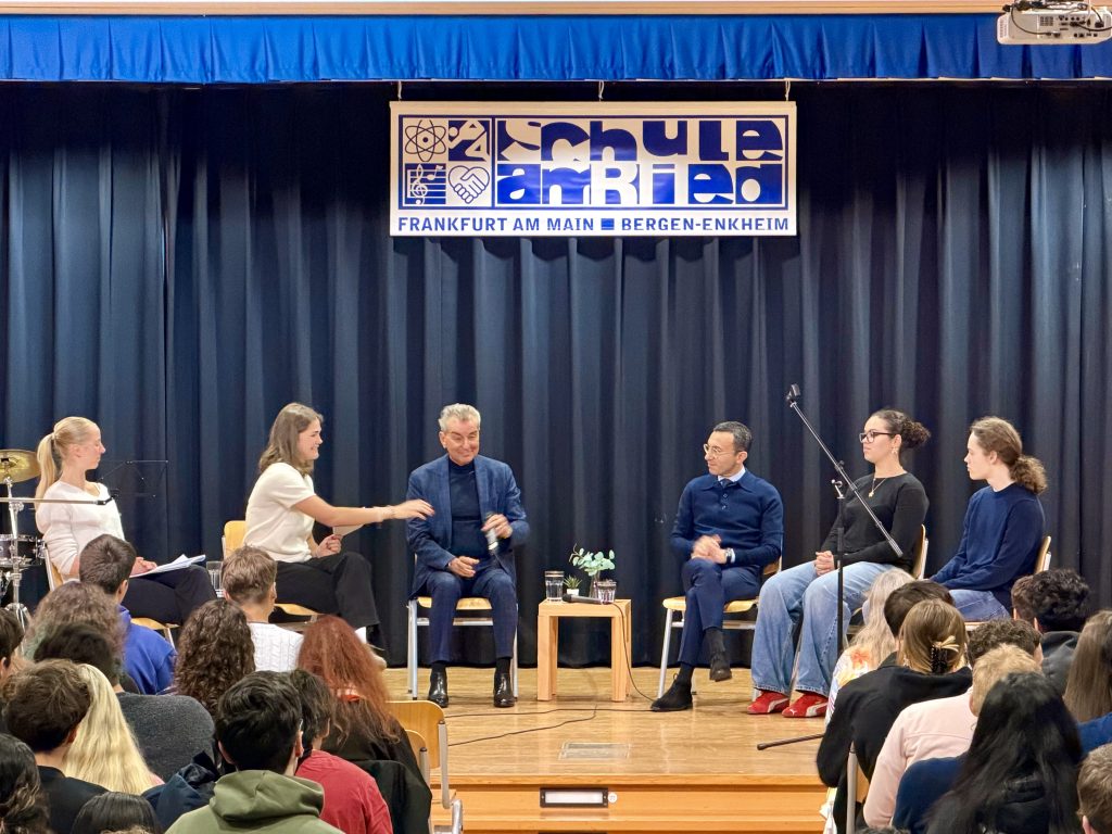 Zu diesem Gesprächsforum mit dem Frankfurter Oberbürgermeister Mike Josef und dem Publizisten und Juristen Michel Friedmann waren die Oberstufe sowie alle 10. Klassen der Schule am Ried am 21. April 2026 eingeladen – die Aula war bis auf den letzten Platz gefüllt.