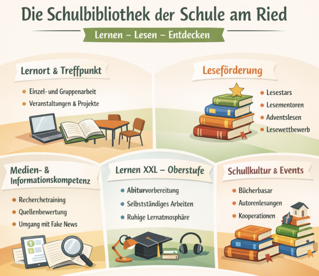 Die Schulbibliothek der Schule am Ried ist ein Ort, an dem Lernen, Lesen und Begegnung zusammenkommen. Sie begleitet die Schülerinnen und Schüler über alle Jahrgänge hinweg und leistet einen wichtigen Beitrag zur Entwicklung zentraler Kompetenzen. Damit ist sie ein unverzichtbarer Baustein für eine nachhaltige und zukunftsorientierte Bildungsarbeit.